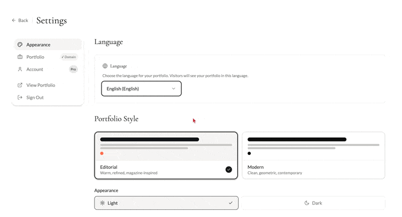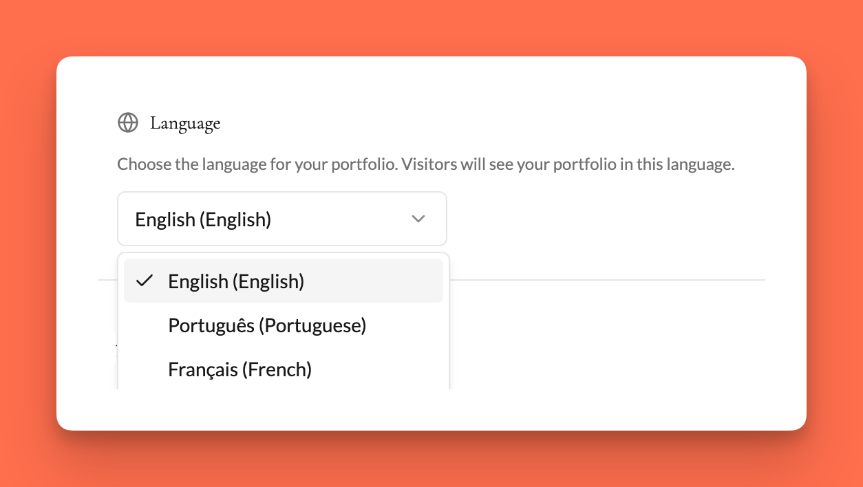 Dropfolio now supports 13 languages. You can now publish your portfolio in English, Japanese, French, Portuguese, Arabic, and many other languages.